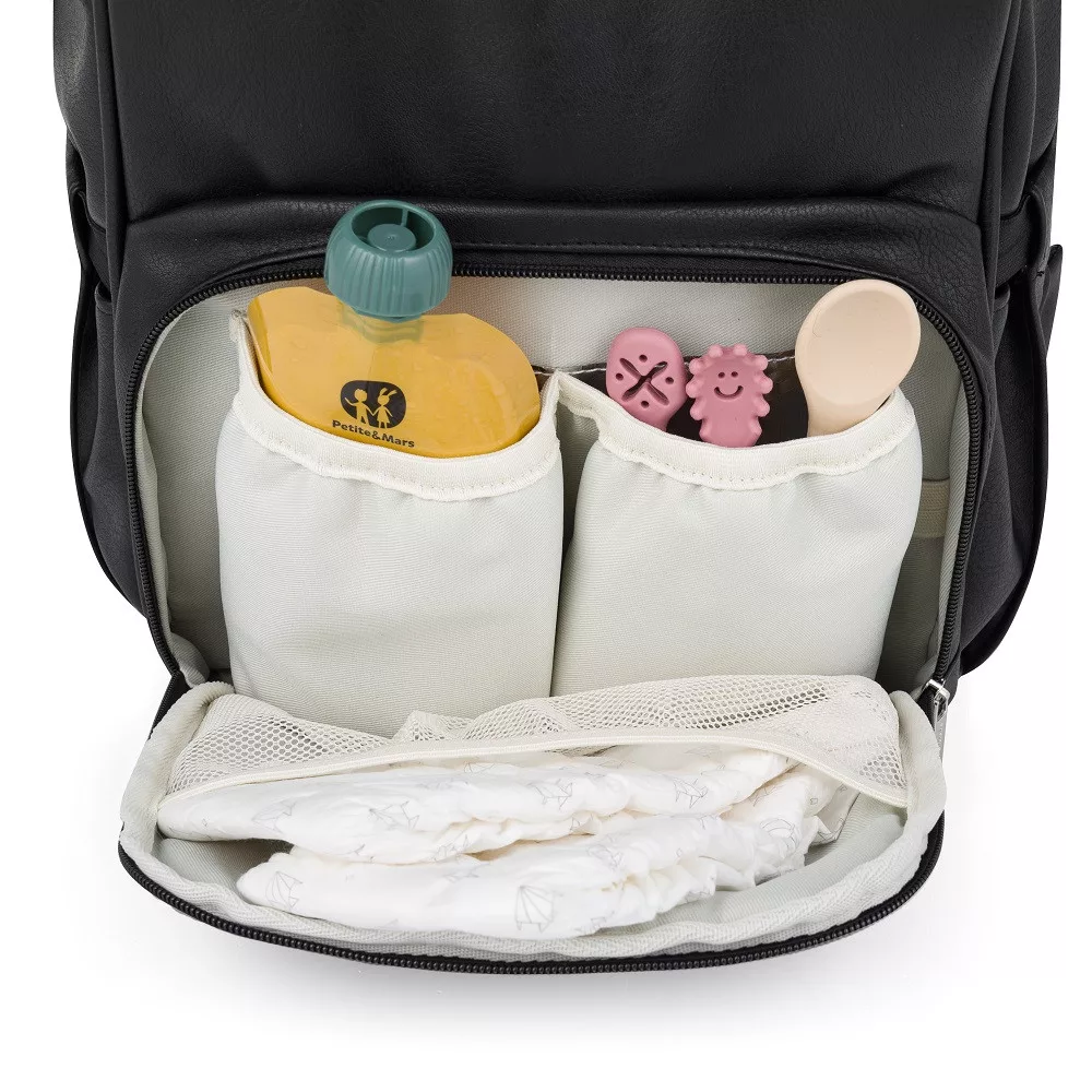 A tágas fő rekesz, amely kétirányú cipzárral záródik, szélesre nyílik, hogy könnyen hozzáférhessen minden szükséges dologhoz. A hátizsák tizenkét funkcionális zsebbel rendelkezik, beleértve a tabletek vagy nedves törlőkendők számára fenntartott zsebet, szigetelt zsebeket, vízálló zsebet a nedves dolgok számára, valamint helyet a palackoknak és kulcsoknak.