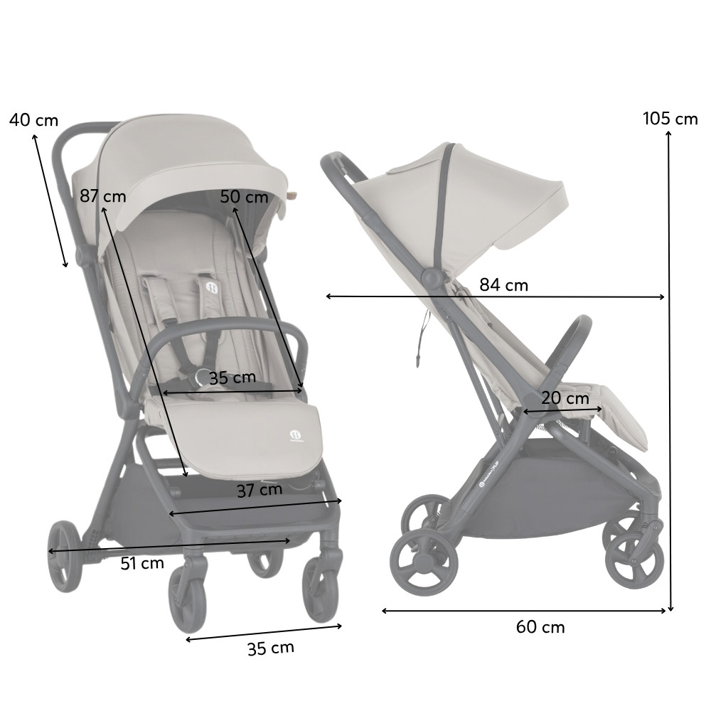 • A babakocsi mérete szétnyitva: 37 x 85 x 105 cm.