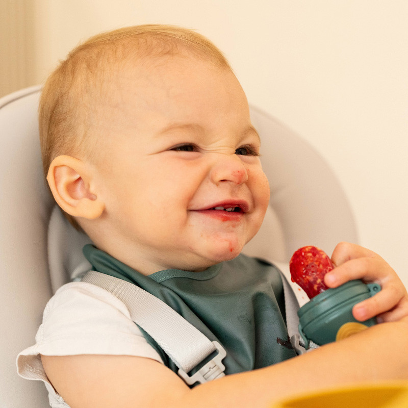 A Fruzi az ideális etető cumi, amely segít a babának biztonságosan megkóstolni a szilárd ételeket, miközben enyhíti a fogínyfájdalmat. Tökéletes a babák számára 6 hónapos kortól. 100% biztonságos szilikonból készült. A Fruzi lehetővé teszi, hogy gyümölcsöt, zöldséget vagy főtt ételt a csecsemők számára legmegfelelőbb formában tálaljon. A szilikon hegyén lévő kis nyílások lehetővé teszik, hogy a kis adagok ellenőrzött módon áthaladjanak az ételből, csökkentve a nagy darabok lenyelésének kockázatát és biztosítva a biztonságos táplálást. Ergonomikus kialakításának és intelligens funkcionalitásának köszönhetően a Fruzi nem csupán egy etetőeszköz, hanem egy nélkülözhetetlen rágóka is, amely enyhülést hoz a fájó ínyre. Ideális segítség az ételek bevezetéséhez 6 hónapos kortól.