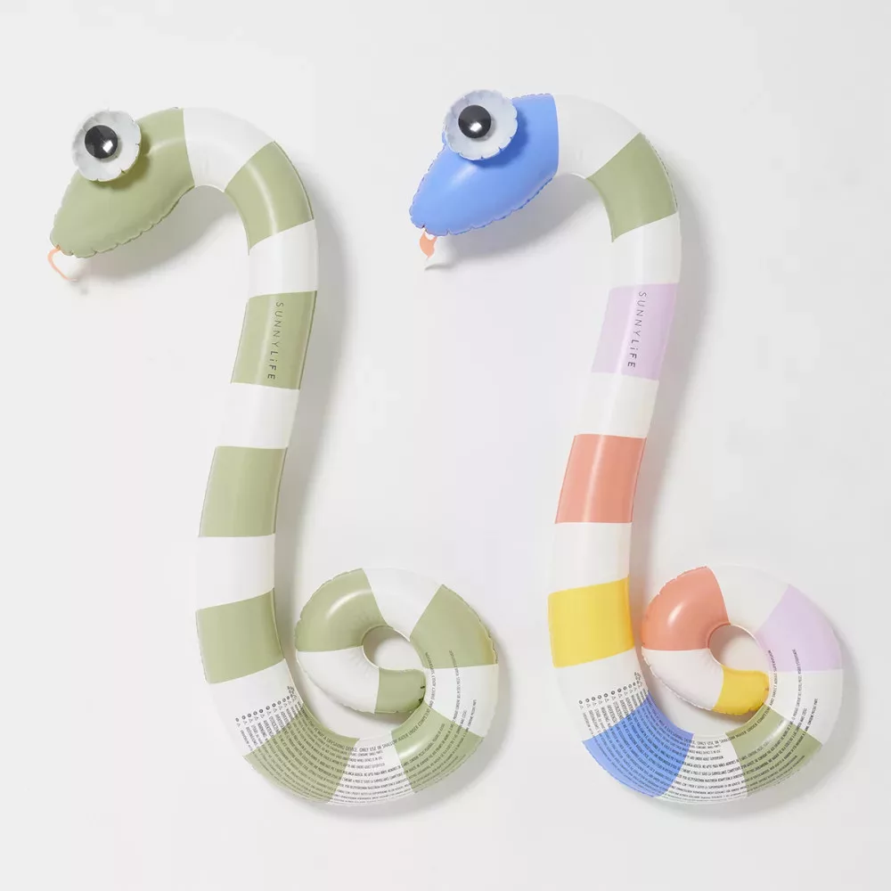 Fedezd fel a vadon izgalmát a Sunnylife Felfújható Kígyó Szettel - Into the Wild, amely két kacskaringós, színes felfújható kígyót tartalmaz, tökéletes kiegészítője a medenceparti és strandjátékoknak. Az egyik kígyó pasztell olivazöld és krémfehér csíkokkal büszkélkedik, míg a másik kék, szürke, rózsaszín, sárga és narancssárga csíkos kivitelben pompázik. Ez a szett célja, hogy megragadja a kisgyermekek képzeletét, miközben órákon át tartó szabadtéri szórakozást biztosít.