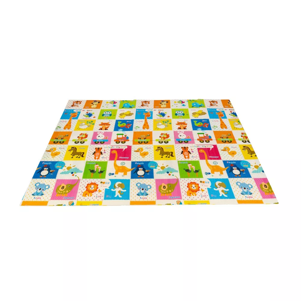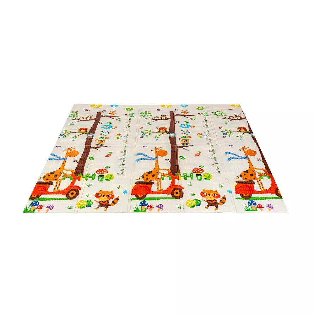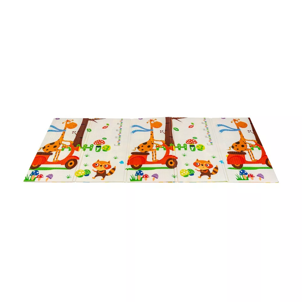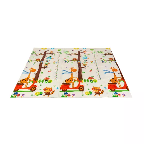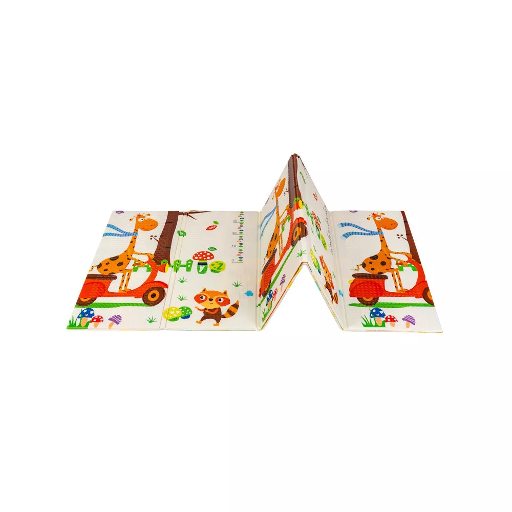A kétoldalú összehajtható szõnyeg színes és változatos mintákat és textúrákat kínál, amelyek segítik fejleszteni a babák látását és tapintását. Tele van állatok képeivel, amelyek támogatják a legfiatalabb felhasználók intellektuális és motoros fejlõdését.