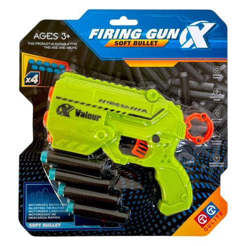 Szivacs lövedék kilövő pisztoly klt. + 4 lövedék, 2 szín, 23x24 cm lapon
