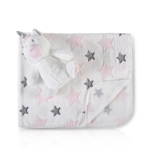 Ez a baba takaró egy különleges darab, amely nem csak melegen tartja a kicsit, de egyben egy szórakoztató játék is, mivel egy plüss unikornis van hozzá csatolva. Egy 90x75 cm méretű, puha, polár anyagból készült takaróról van szó, amely a legjobb választás a kuckózásra vagy ajándékozásra. Az unikornisos és csillag mintás design pedig minden kislány álma. Nem csak hasznos, de nagyon cuki is, tökéletes választás bármilyen alkalomra.