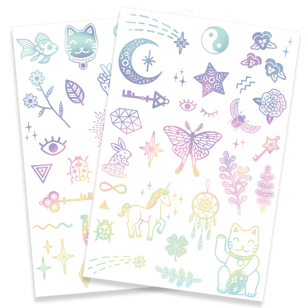 Két lap ideiglenes tetoválás, amely szerencsét hozó szimbólumokat ábrázol. A gyerekek legnagyobb örömére teljesen be vannak borítva csillogó és színjátszó anyaggal! Könnyen használhatóak, ezek az ideiglenes tetoválások előre kivágottak, és egy kis vízzel felhelyezhetők. Bőrgyógyászatilag tesztelt.