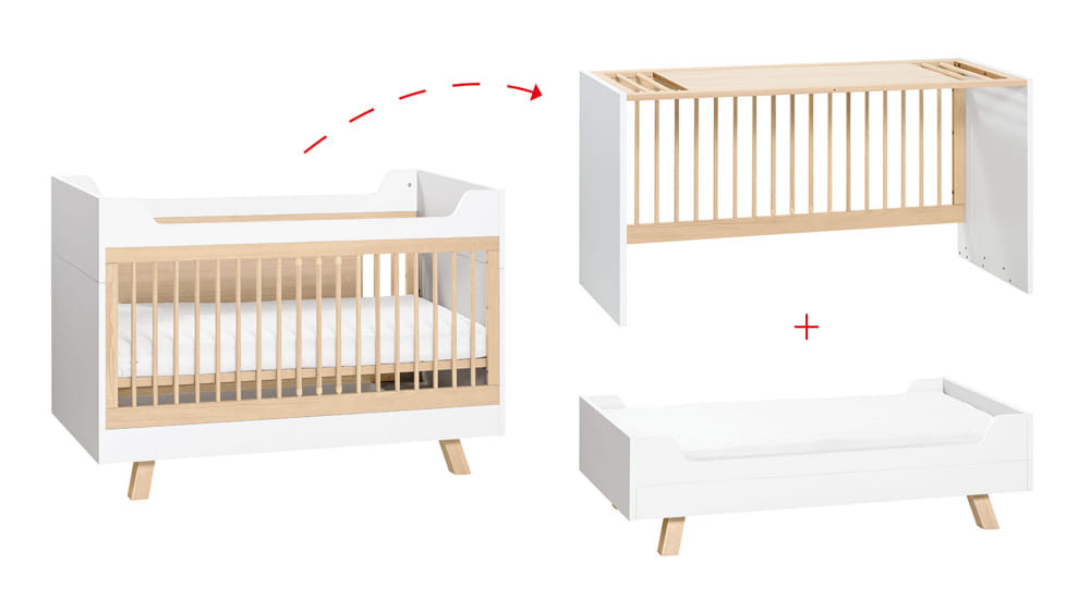 • A kiságy később heverővé alakítható, és a fennmaradó elemekből egy íróasztal is készíthető.
