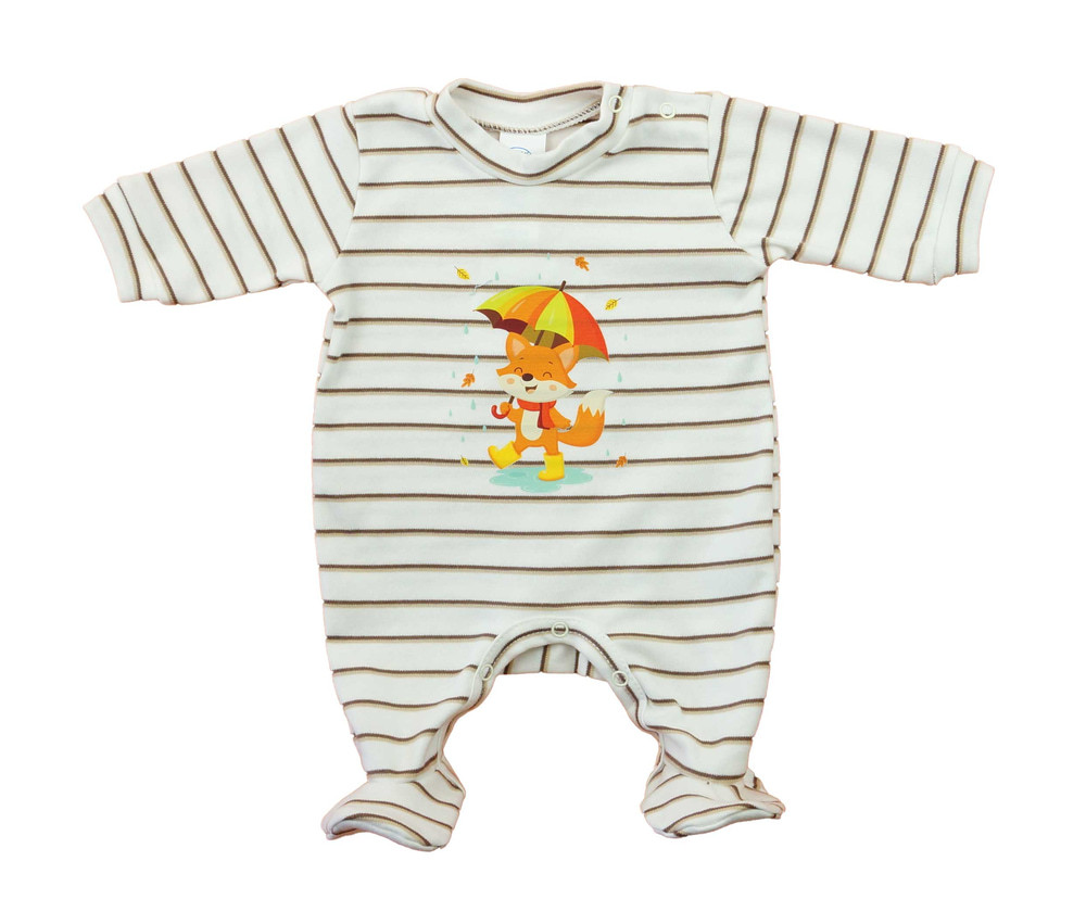 Praktikus és kényelmes viselet ez a csíkos alapayagól készült cuki mintával nyomott baba rugdalózó. Vállán patentos, így megkönnyíti a picik öltöztetését. A lába közötti patentos megoldás a peluscserénél nagy segítség Az egyik legjobb megoldás különösen újszülötteknél és az első néhány hónapban. Minőségi, 100% pamut bababarát anyagból készült, ami jól mosható, könnyen kezelhető.