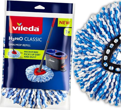 A Vileda H2prO Spin Mop mikroszálas utántöltő felmosófej extra nedvszívó, mikroszálas pótfej, amely hatékonyan gyűjti össze a koszt és port kemény padlókról. Tartós és mosható kialakításának köszönhetően ideális minden napi takarításhoz.
