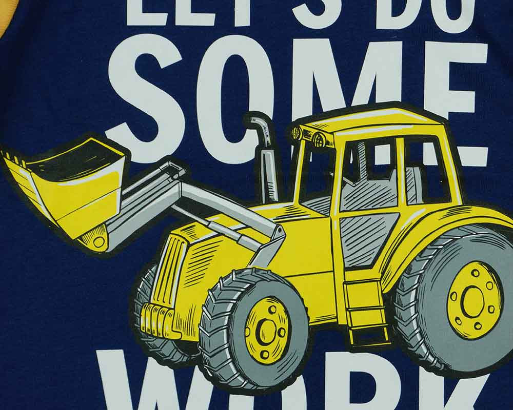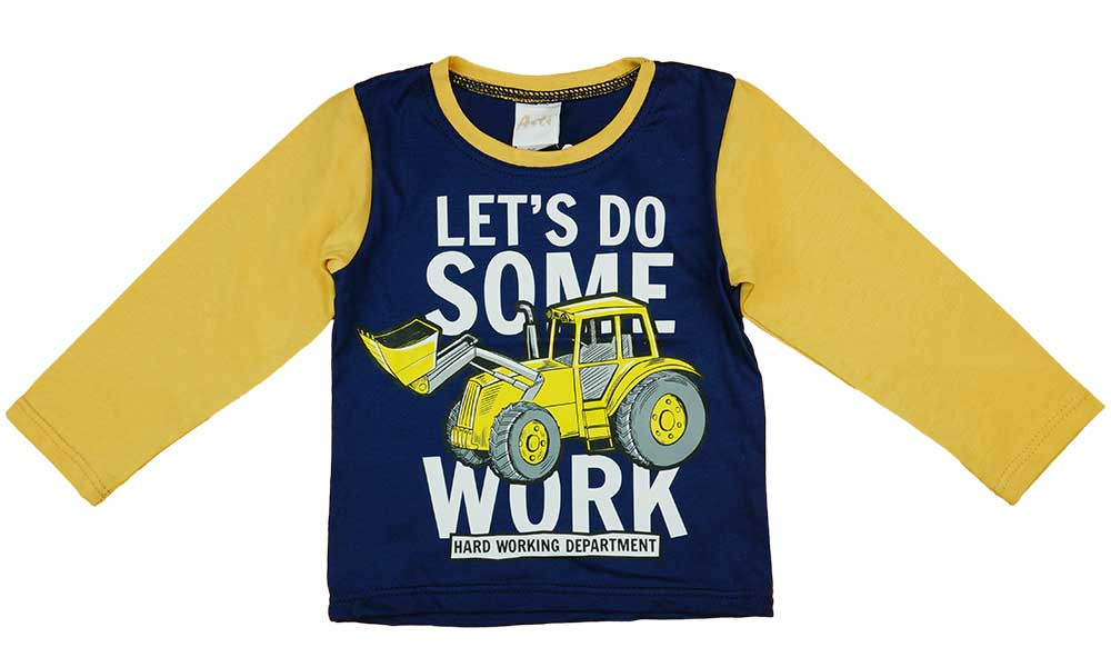 Hosszú ujjú kisfiú póló munkagépes mintával sötétkék és sárga színben
