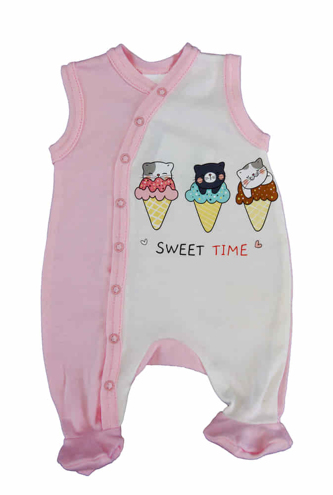Egy igazán stílusos kiegészítő a kislányok ruhatárában, ez az ujjatlan rugdalózó ruha, amely magával ragadó cicás-fagyis mintával díszített. Rózsaszín színének köszönhetően igazán lányos és kedves darab. A ruha elől és a lábközöttben is patentos kialakítást kapott, ami megkönnyíti az öltözködést és a pelenkázást is.