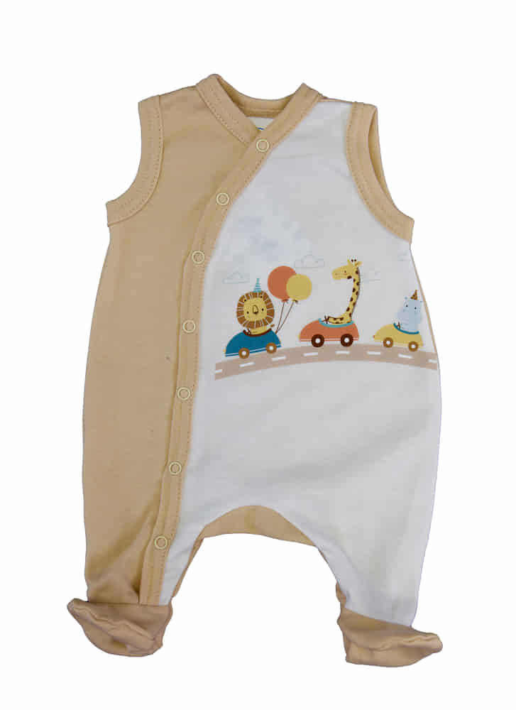 Ez a vidám, állatkerti mintás ujjatlan baba rugdalózó minden kisgyermek gardróbjának nélkülözhetetlen darabja. A homokszínű, 100% pamutból készült ruha nem csak kényelmes, hanem praktikus is. A váll- és a lábközötti patentos kialakítás segítségével a pelenkázás és az öltöztetés gyerekjáték lesz. A rugdalózó könnyű, vékony anyaga tökéletes választás a nyári hőségben, míg hűvösebb időben egy réteggel kiegészítve is viselhető. A vidám, állatkerti minta garantáltan mosolyt csal minden kisgyermek arcára. A rugdalózó könnyen kezelhető, mosógépben tisztítható, és hosszú használat mellett is megőrzi színét és formáját. Büszkék vagyunk rá, hogy termékünk magyar minőségi darab, amely minden apró részletében a gondoskodást és a minőséget tükrözi. Anyaga: 100% pamut, minősége: I. osztály.