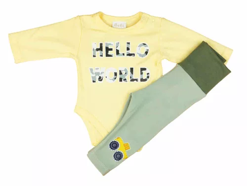 A kisfiúk divatjának legújabb trendjét képviseli ez a 2 részes, pasztel sárga szett, amelynek minden darabja Magyarországról származik. Az összeállításban található hosszú ujjú body és kényelmes baba nadrág igazán vagány és kispasis hangulatot kölcsönöz viselőjének. Mindkét darab finom pamut anyagból készült, a nadrág rugalmas pamutja pedig szabad mozgást biztosít a babának. A szett kiváló minőségű, jól mosható, szín- és formatartó anyaga miatt nemcsak a babák, de az anyukák kedvence is lesz! A body 100% pamutból, a nadrág 90% pamutból és 10% elasztánból készült, ezáltal biztosítva a kiváló minőséget. A termék nikkelmentes patenttal készül, így az érzékeny babák sem fognak allergiás reakciót tapasztalni.