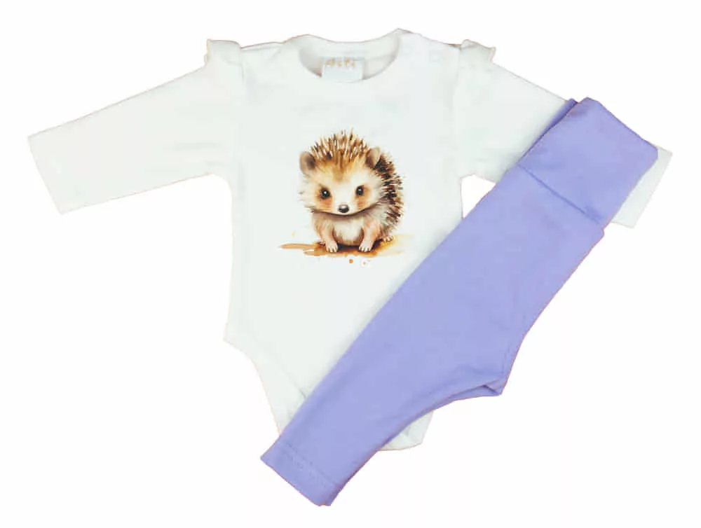 Ez a 2 részes, sünis mintával díszített kislány szett igazi ínyencség a kicsik számára. A szett egy hosszú ujjú, fodros vállú bodyból és egy baba nadrágból áll, mindegyik darabot finom, puha pamutból készítettük. A nadrág rugalmas pamut anyaga pedig gondoskodik a kényelemtől és a szabad mozgástól. A szett könnyen mosható, színei és formája hosszan megőrzi eredeti állapotát, így biztosan a szülők is imádni fogják ezt a praktikus és stílusos ruhadarabot.