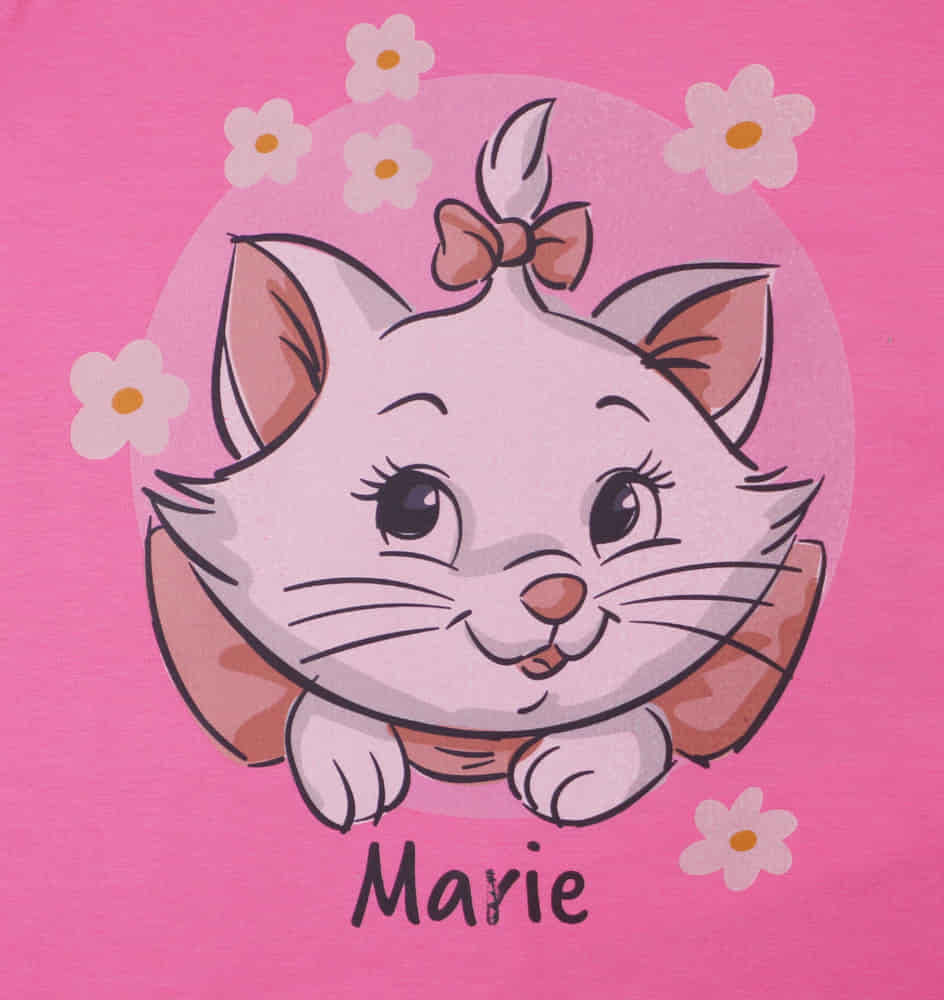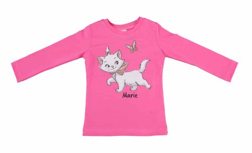 Hosszú ujjú kislány póló enyhén rugalmas pamut anyagból. Praktikus alapdarabja kislányunk ruhatárának, amit nadrággal, szoknyával is viselhet. Az elején aranyos Marie cica mintával nyomva, ami garantálja, hogy kislányunk is szeretni fogja. Minőségi, könnyen kezelhető, szín- és formatartó anyagból készült.
