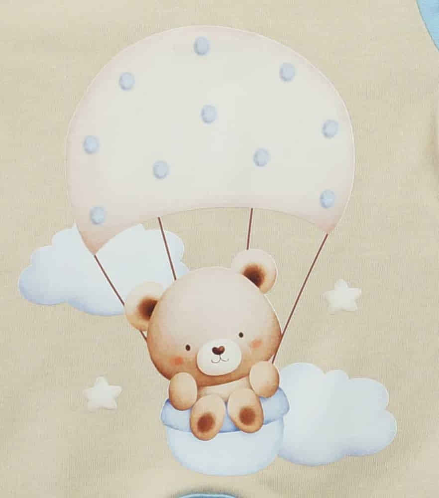 A kényelem és a stílus tökéletes kombinációját kínálja ez kisfiú rugdalózó, amelyet maci mintával díszítettünk. vékony pamut, bababarát anyagból készült, kényelmes viseletet biztosítva egész napra. Vállán patentos, így megkönnyíti a picik öltöztetését. A lába közötti patentos megoldás a peluscserénél nagy segítség. Jól mosható, szín- és formatartó anyagból készült.