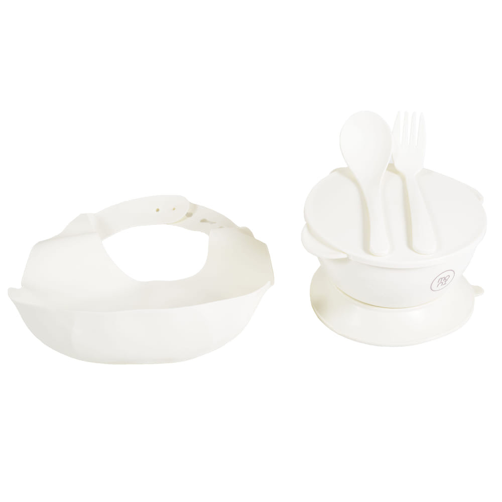 • Szilikon előke, fedeles tál csúszásmentes alappal, kanál és villa – minden szükséges az első önálló falatokhoz