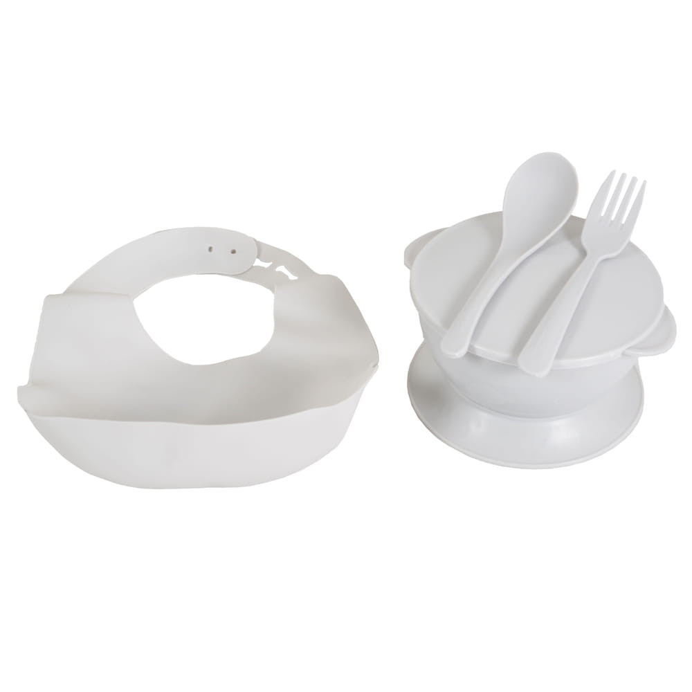 • Szilikon előke, fedeles tál csúszásmentes alappal, kanál és villa – minden szükséges az első önálló falatokhoz