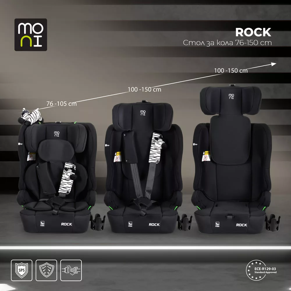 Moni Rock autós ülés 76-150cm, 2játékkal, pohártartó, belső öv, isofix nélkül fekete