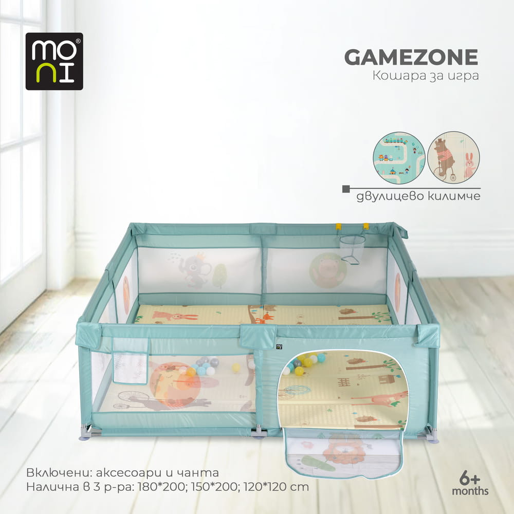 Moni Gamezone járóka összecsukható szőnyeggel, 60 labdával 180x200 menta