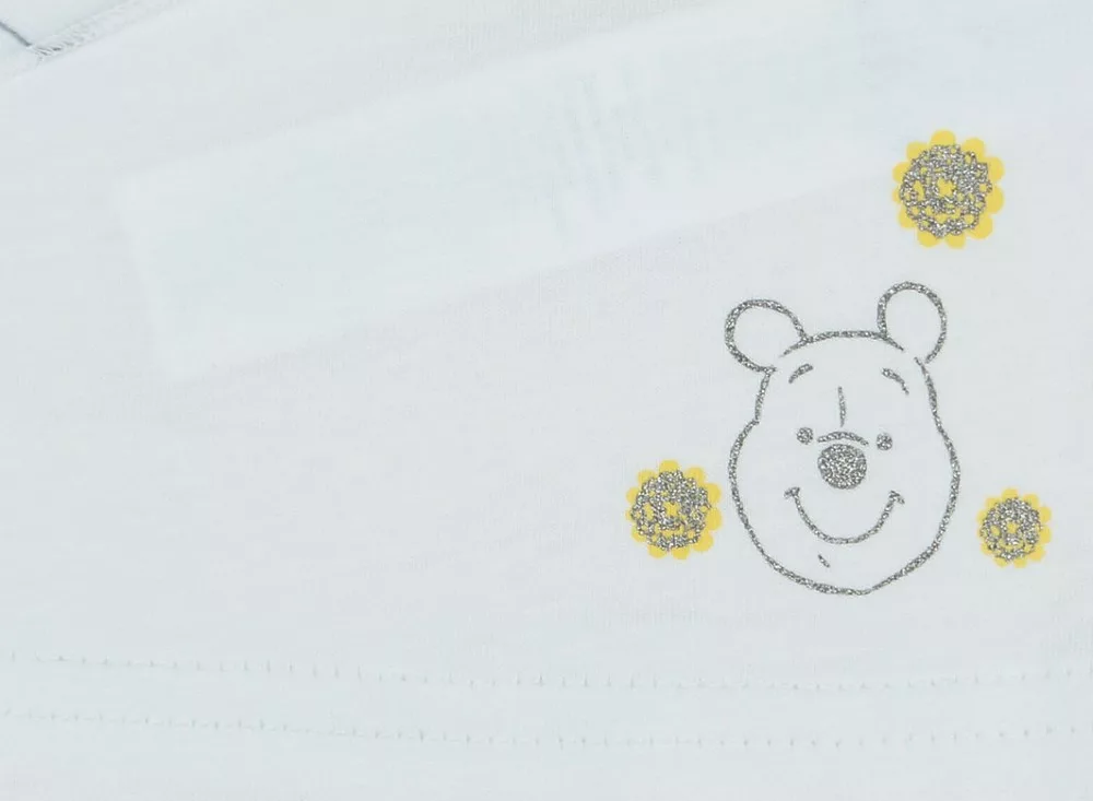 Az Ön kislányának a Disney varázsvilágába illő legelegánsabb viseletét kínáljuk ezzel a 2 részes Micimackó szettel. A szett tartalmaz egy vállon patentos, húzott rövid ujjú pólót, melynek elején glitteres Micimackóval van díszítve - a legédesebb rajzfilmhős, akit gyermekünk ismerni lehet. A virágos muszlin anyaggal dekorált a póló, melynek alapanyaga 100% pamut, a kiegészítő anyaga pedig 100% poliészter. A szett másik darabja a szárán glitteres Micimackóval nyomott és 3/4-es hosszúságú leggings, melynek anyaga 90% pamut és 10% elasztán. Ez a szett nem csak kényelmes, hanem még stílusos is, így a kislányok imádni fogják viselni. Mindez eredeti Disney termék, mely garantálja a minőséget és a tartósságot.