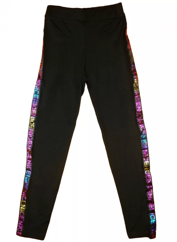 Egyszínű fekete hosszú leggings, gumis derékkal, oldalán többszínű fémes hatású felirattal