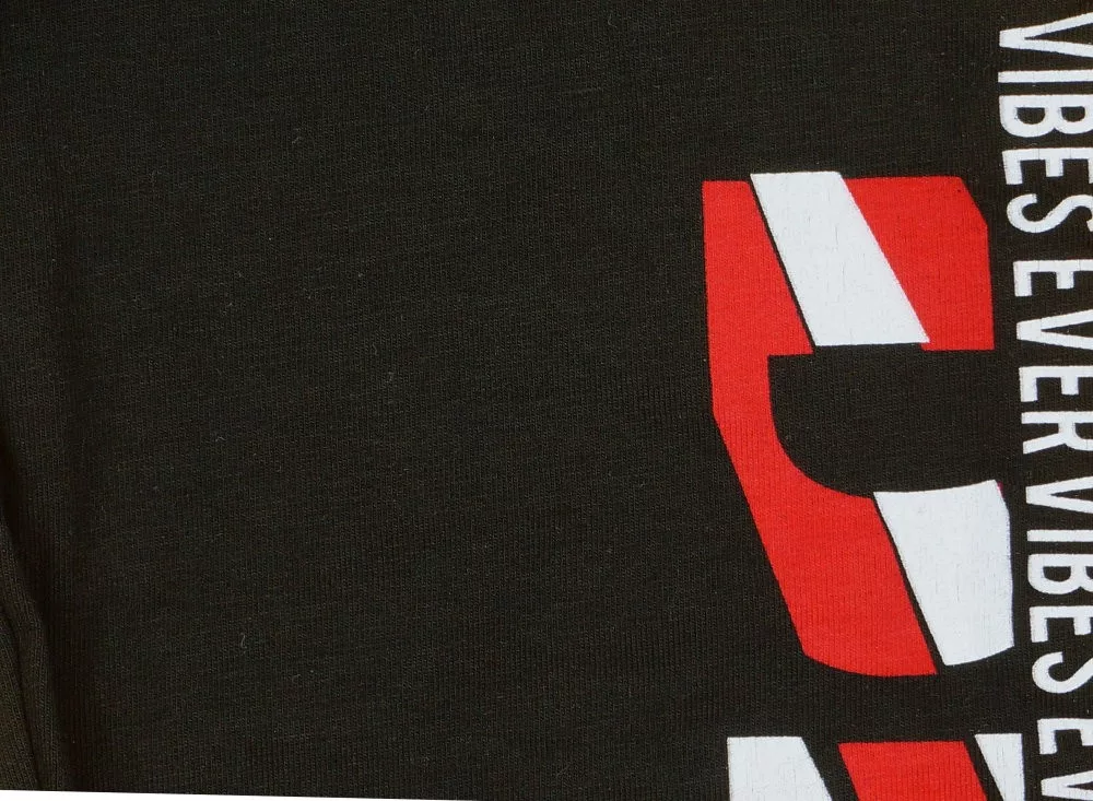 Egyszínű fekete hosszú leggings, gumis derékkal, oldalán piros-fehér felirattal
