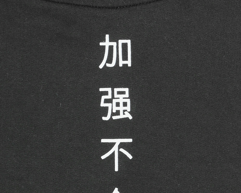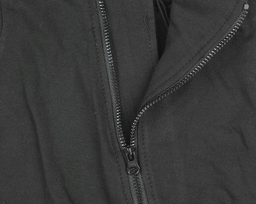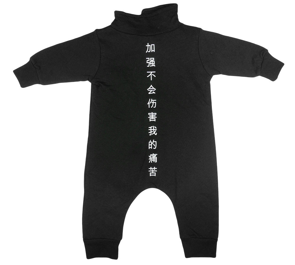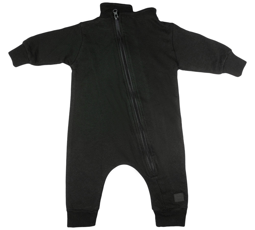 Hosszú ujjú, belül bolyhos elöl ferdén egészen a lábszárig cipzáras rugdalózó, hátán felirattal.