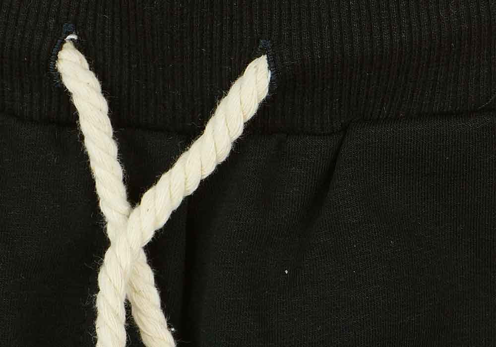 Melegítő anyagú univerzális nadrág, rugalmas 100% pamut anyagból, gumis derékkal, a derékpánton zsinórbehúzással, oldalsó zsebekkel, elöl "ál" sliccel, bokánál passzéval. Hímzett Mini and Me logóval.