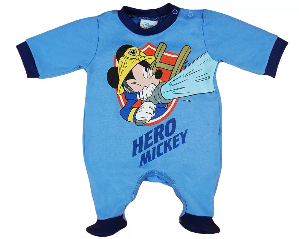 Mickey tűzoltós mintával nyomott, vállon patentos, hosszú ujjú baba rugdalózó.
