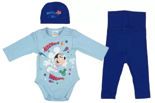 Ebben a 3 részes baba kisfiú szettben igazi kis hercegként pompázhat a babád! A világoskék és királykék színű szett egy hosszú ujjú bodyból, egy baba nadrágból, valamint egy sapkából áll, mindegyik darabon pedig a mindenki által jól ismert és szeretett Mickey egér mintája díszeleg. Az eredeti Disney termék garantáltan mosolyt csal a kicsi arcára! A body és a nadrág bababarát, könnyen kezelhető pamut anyagból készült, ami nem csak nagyon cuki, de kényelmes is. A rugalmas nadrág szabad mozgást biztosít, míg a sapka elasztikus anyaga tökéletesen illeszkedik a baba fejére. Minőségi magyar termékről van szó, amit a könnyű tisztítás, a szín- és formatartó anyag, valamint a 100% pamut és 90% pamut, 10% elasztán összetétel tesz az anyukák számára is ellenállhatatlanná. Az I. osztályú minőség garantálja, hogy a szett hosszú ideig biztosítsa a kényelmet és a stílusos megjelenést.