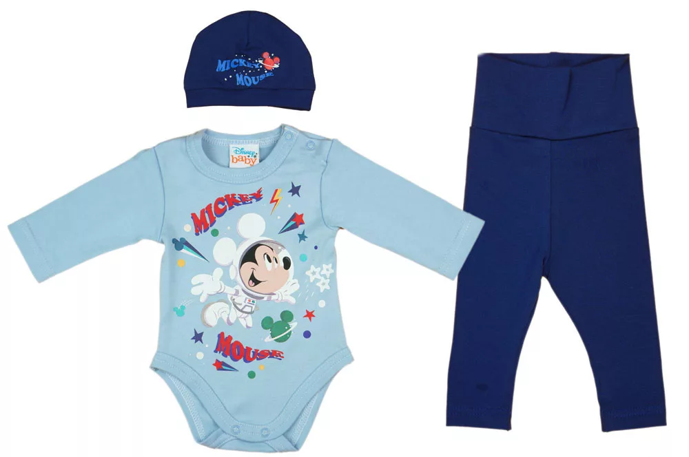 Minden kisfiú élete első hőse Mickey egér, ezért hoztuk el nektek ezt a 3 részes szettet, mely egy hosszú ujjú bodyból, egy nadrágból és egy sapkából áll, mindegyikőjükön a vidám Mickey egér mintájával. Az eredeti Disney termék garantáltan elvarázsolja a kicsiket, míg a puha, 100% pamut anyaga biztosítja a kényelmet és szabad mozgást egész nap. A nadrág rugalmas anyagának köszönhetően könnyedén illeszkedik a baba testéhez, míg a sapka jól tapad a fejére. A szett könnyen kezelhető, jól mosható és szín- és formatartó, így nemcsak a babák, de az anyukák számára is tökéletes választás. Minőségi magyar termék, melyben a kisfiúk igazi kis hősökké válhatnak!