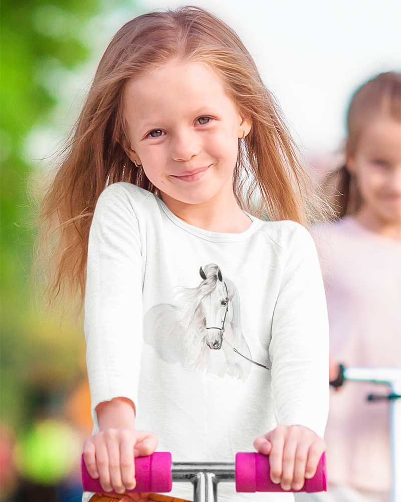 Hosszú ujjú mintás kislány póló enyhén rugalmas pamut anyagból. Praktikus alapdarabja kislányunk ruhatárának, amit nadrággal, szoknyával is viselhet. Minőségi, könnyen kezelhető, szín- és formatartó anyagból készült.