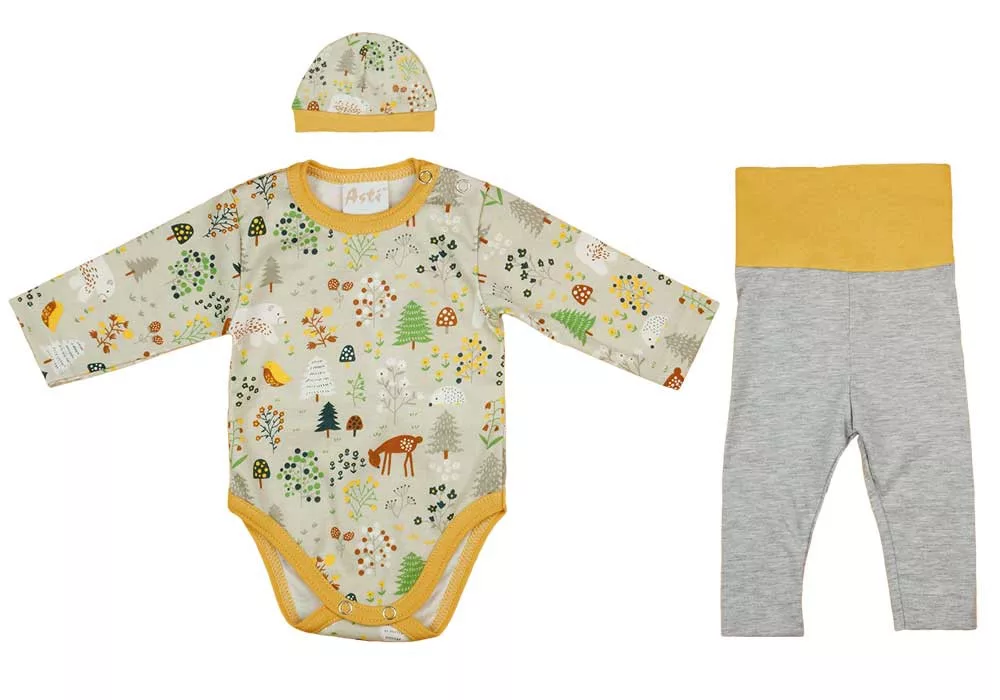 Engedje meg, hogy bemutassuk Önnek ezt a csodálatosan kényelmes, 3 részes baba szettet, melynek minden darabját vidám állatfigurák díszítik. A szett hosszú ujjú bodyból, nadrágból és sapkából áll, melyeket a kisbabák imádni fognak. A body vállán praktikus patentok segítik a könnyű öltözködést, miközben a baba nadrág és sapka garantálja a melegséget és a kényelmet. Az összes termék 100% pamutból készült, míg a nadrág anyagában 10% elasztán is helyet kapott a tökéletes illeszkedés érdekében. Minőségi magyar termék, melyet az Andrea Kft. gyártott, I. osztályú, nikkelmentes anyagokból, hogy még az allergiára hajlamos babák is bátran viselhessék.