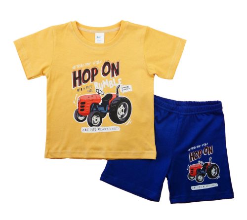 Fedezd fel ezt az imádnivaló 2 részes kisfiú nyári szettet, amely traktoros mintával nyomott rövid ujjú pólóból és gumis derekú, oldalt zsebes rövidnadrágból áll. A szett színével és vidám traktoros mintájával garantáltan hódít az aktív kisfiúk körében. Magyarországon készült, minőségi termék, mely hű társ lesz a nyári kalandokban. Anyaga 100% pamut, ami a meleg nyári napokon is hűvösen tartja a bőrt. A zsebek tökéletesek a kincsek számára, amiket gyermeked talál a kalandjai során.