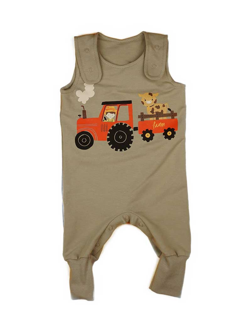 A homokszínű, traktoros mintával díszített ujjatlan rugdalózónk igazi kedvenc lesz a kis traktorrajongóknál. Az állítható lábrész és kantár révén a rugdalózó a gyermekkel együtt nő, így hosszú ideig kényelmes viseletet biztosít. Praktikus kialakításának köszönhetően a lábközött patentos, ami megkönnyíti a pelenkázást, így a szülők is nagyra értékelik majd ezt a darabot. Könnyű, vékony, enyhén elasztikus anyaga bababarát, így ideális választás tavaszi napokra. Hosszú vagy rövid ujjú bodyval is kombinálható. Minőségi magyar termék, mely 90% pamutból és 10% elasztánból készült. A nikkelmentes patenttal készült rugdalózó nem vált ki allergiás reakciót a nikkelre érzékeny babáknál.