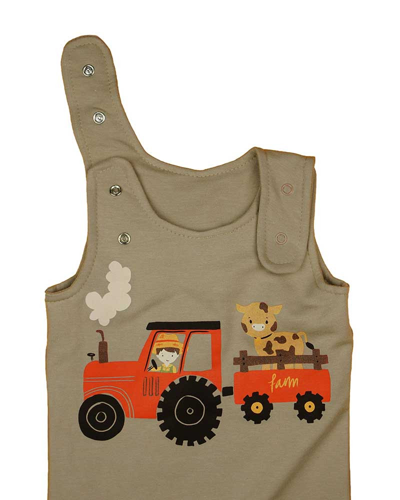 A homokszínű, traktoros mintával díszített ujjatlan rugdalózónk igazi kedvenc lesz a kis traktorrajongóknál. Az állítható lábrész és kantár révén a rugdalózó a gyermekkel együtt nő, így hosszú ideig kényelmes viseletet biztosít. Praktikus kialakításának köszönhetően a lábközött patentos, ami megkönnyíti a pelenkázást, így a szülők is nagyra értékelik majd ezt a darabot. Könnyű, vékony, enyhén elasztikus anyaga bababarát, így ideális választás tavaszi napokra. Hosszú vagy rövid ujjú bodyval is kombinálható. Minőségi magyar termék, mely 90% pamutból és 10% elasztánból készült. A nikkelmentes patenttal készült rugdalózó nem vált ki allergiás reakciót a nikkelre érzékeny babáknál.