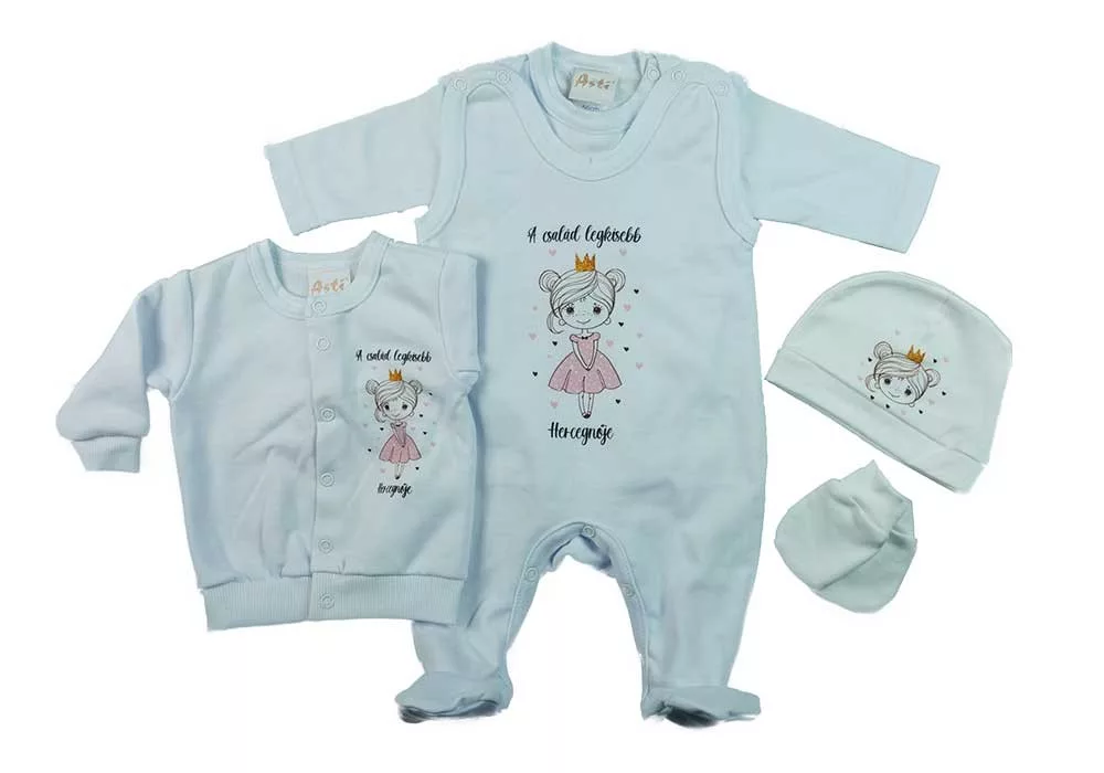 Kényeztesse kis hercegnőjét ezzel az öt részes, belül bolyhos szettünkkel, melyben minden megtalálható, amire egy kisbaba csak vágyhat. Az ujjatlan, vállon patentos rugdalózónk hercegnős mintával nyomott, mely minden kislányt elvarázsol. A szett része továbbá egy hosszú ujjú, vállon patentos baba body, amely kényelmes viseletet biztosít a hidegebb napokon is.