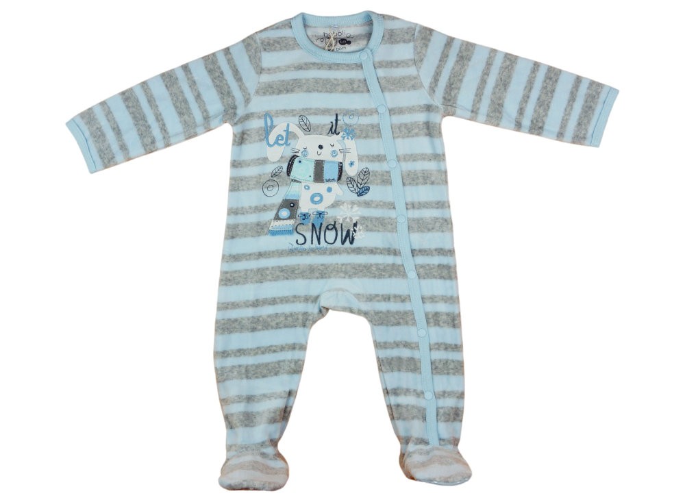 Elöl végig patentos, elején nyuszi mintával díszített hosszú ujjú plüss rugdalózó, talpán csúszásgátlóval