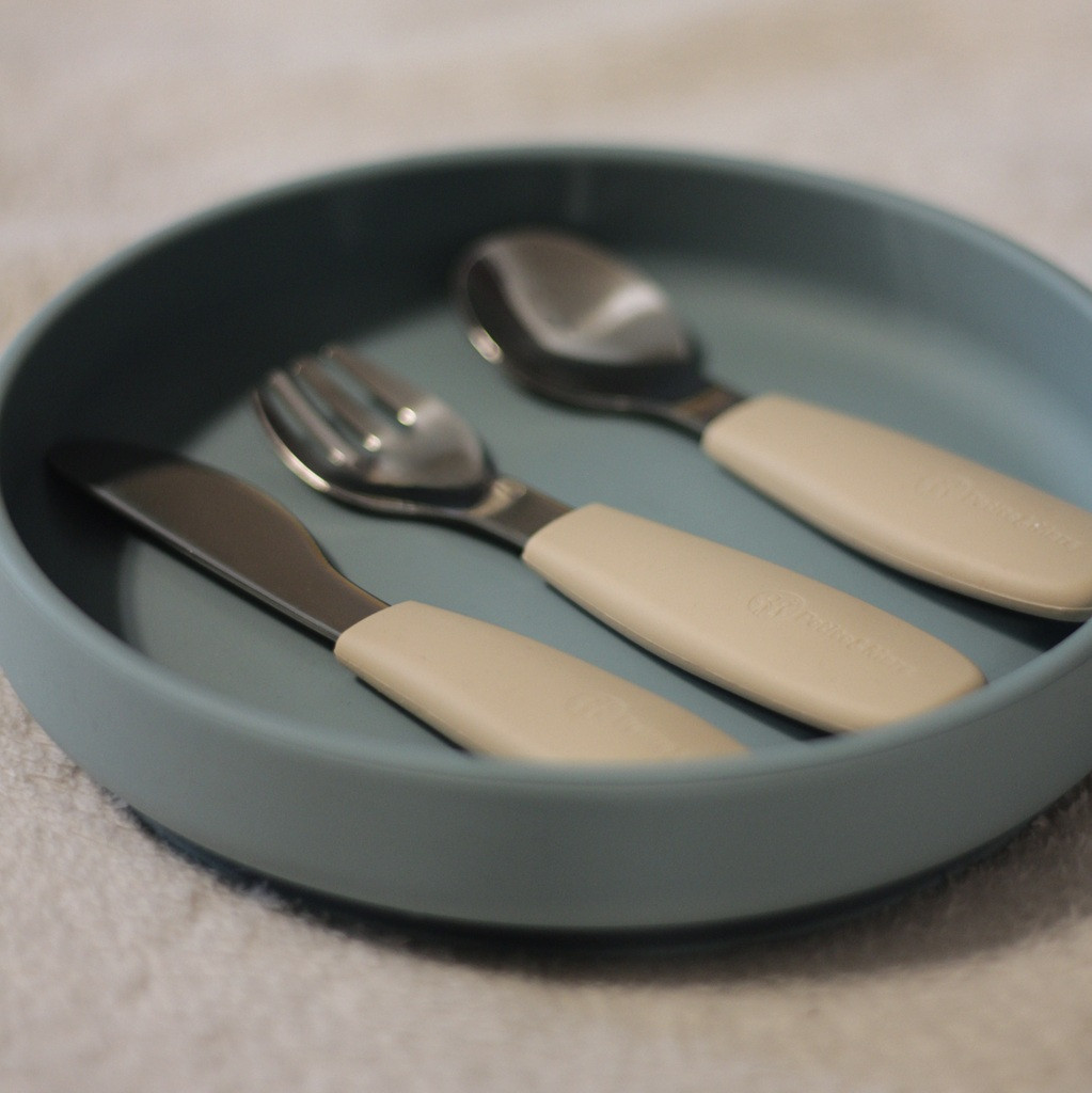 A funkcionális részek kiváló minőségű rozsdamentes acélból készülnek, a fogantyúk ergonomikusak és puha, élelmiszerekkel való érintkezésre alkalmas szilikonnal vannak bevonva - ideális a gyermekkéz számára. Ez kényelmes és biztonságos fogást biztosít, és elősegíti a helyes étkezési szokásokat.