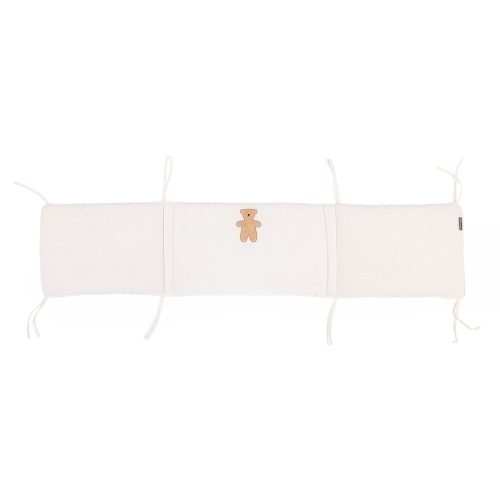 Ez az ultra-puha ágyvédő a Teddy kollekcióból kiváló minőségű pamutból készült. Megvédi a kicsit az ágy kemény oldalaitól, így a baba biztonságosan és kényelmesen tud aludni. A gyönyörű design azonnali csodás hangulatot kölcsönöz a gyerekszobának. Az ágyvédő mindkét oldala használható, az egyik oldala ekrü, a másik pedig bézs színű. Az oldalsó hevedereknek köszönhetően az ágyvédő könnyen rögzíthető a kiságy léceihez.