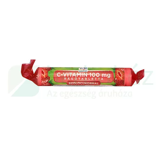 Az 1×1 Vitamin C-vitamin 100 mg eper ízű étrend-kiegészítő rágótabletta szőlőcukorral rágótablettánként 100 mg C-vitamint tartalmaz.