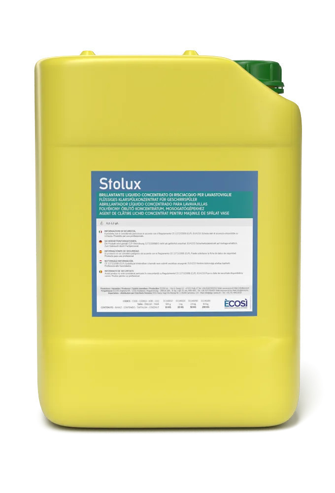 A STOLUX egy aktív öblítőszer mosogatógépekhez, csészemosogatókhoz és pohármosogatókhoz. Azonnali száradást biztosít foltok és csíkok nélkül. Öblítő hatását magas vízkeménység és 75-85°C-os öblítési hőmérséklet esetén is kifejti.