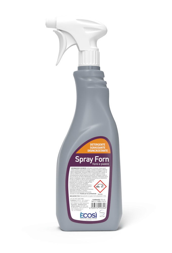 A SPRAY FORN egy erős zsíroldó hatású tisztítószer, amely eltávolítja a szénlerakódásokat és a lerakódásokat sütőkről, grillsütőkről, főzőlapokról és általános tűzhelyekről. Minden fémfelületen (öntöttvas, vas, rozsdamentes acél vagy egyéb) használható, kivéve az erős lúgokra érzékeny felületeket, mint például az alumínium vagy a horganyzott fém. Különösen hatékony a kávéfőzők karjainak tisztításában is.
