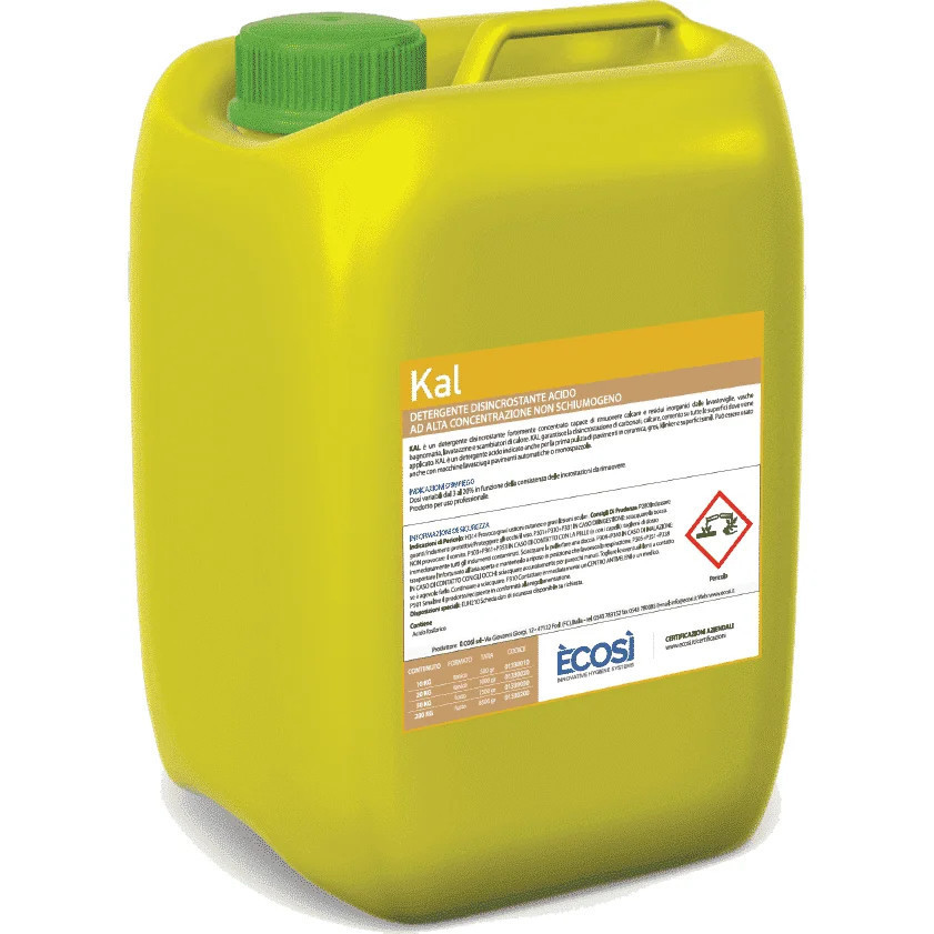 ÈCOSÌ Kal – Nem habzó, savas vízkőoldó koncentrátum (10L) A Kal egy nagyon magas koncentrációjú, nem habzó savas vízkőoldó, amelyet ipari és professzionális felhasználásra terveztek. Kiválóan alkalmas kemény víz okozta lerakódások eltávolítására, legyen szó kazánokról, mosógépekről vagy más berendezésekről. Gyorsan hat, könnyen leöblíthető, és nem habzik, így különösen praktikus automata rendszerekhez vagy ipari környezetben.