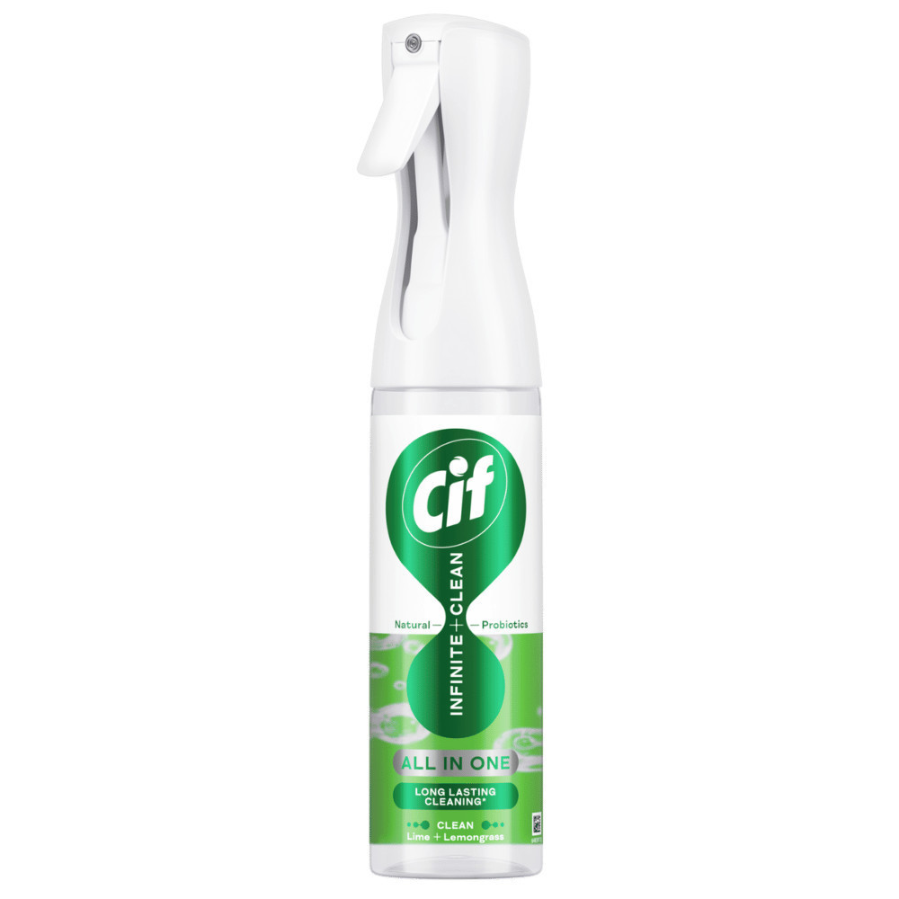 A CIF Infinite+Clean All in One tisztítóspray, multisurface, azaz többféle felületen alkalmazható: konyhai munkalapok, csempék, tükrök, üvegfelületek, csaptelepek, de akár könyvespolc, elektronikai eszköz burkolata is. Innovatív „probiotikum technológiával” rendelkezik, ami azt jelenti, hogy az egyszeri használat után a termék hatása még napokig (akár 3 napig) is folytatódhat a kemény felületeken.