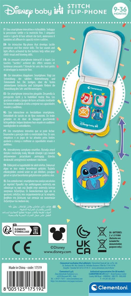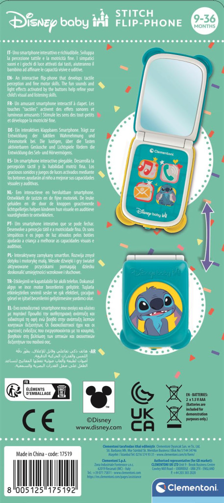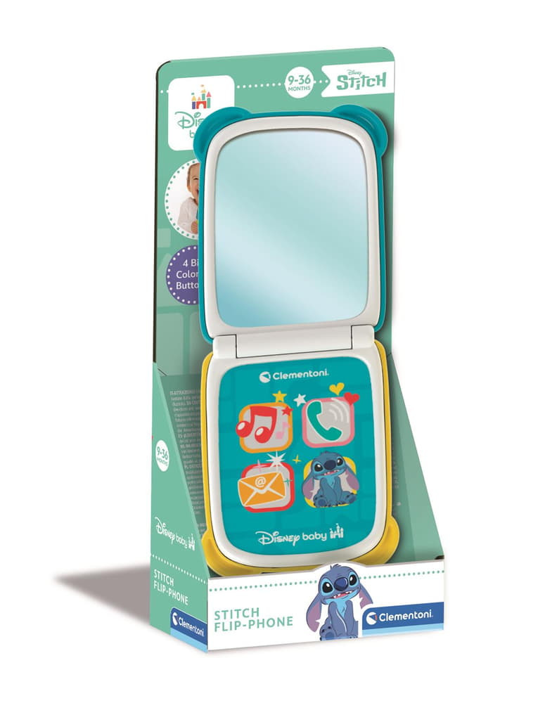 Bébi mobiltelefon, el., hang+fény, érintőképernyős, kihajtható, Disney, Lilo és Stitch, 10x22 cm dob.