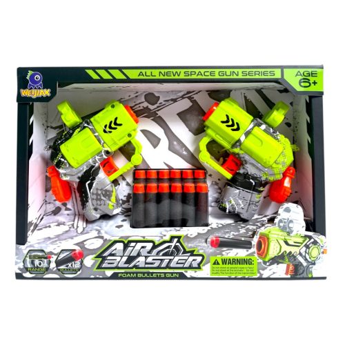 Szivacs lövedék kilövő pisztoly klt., 2 db pisztoly + 12 lövedék, 29x21 cm dob.