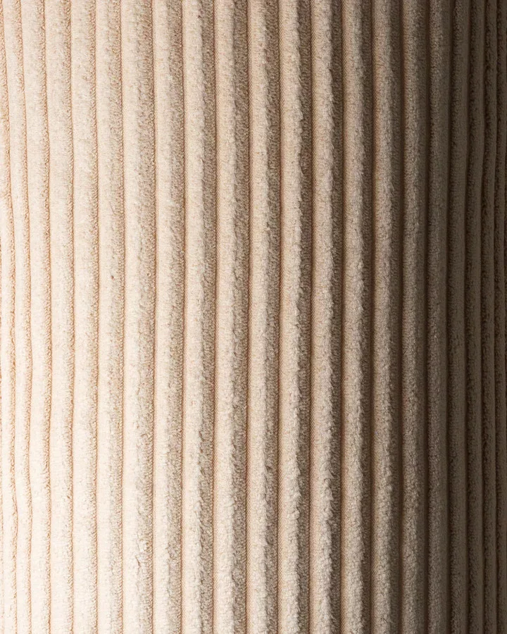 Fenntartható anyaghasználat – OEKO-TEX® és GRS® tanúsítvánnyal rendelkező széles bordás kordbársony, újrahasznosított PET palackokból, 100% poliészter.
