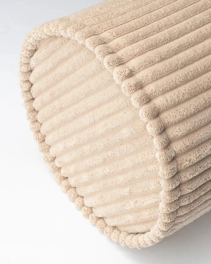 Prémium anyaghasználat – OEKO-TEX® és GRS® tanúsítvánnyal rendelkező széles bordás kordbársony, újrahasznosított PET palackokból.